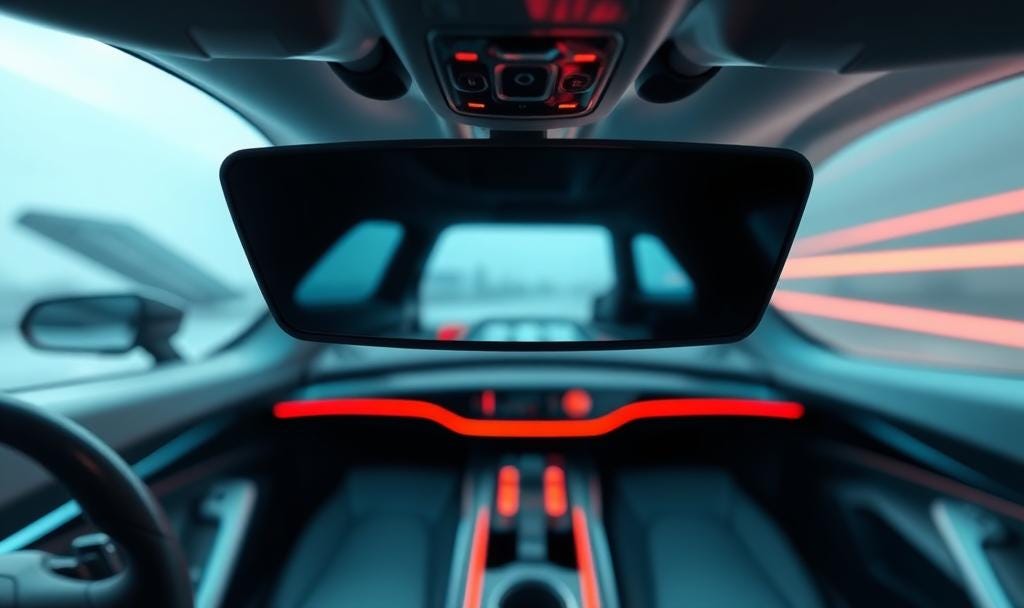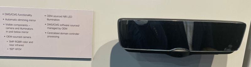Smart Eye has announced two design wins for interior sensing with a Korean OEM, most probably Hyundai Motor Company (or Kia, or Genesis). Of significance is the declaration that the image sensor for this win is "integrated inside the rear-view mirror." This almost certainly confirms a Smart Eye alliance with Gentex for dumb mirrors, and the actual mirror win is judged to be shown in the image image, which was on display on the Gentex stand at CES. The CMOS image sensor and IR illuminators are shown located in the mirror chin.