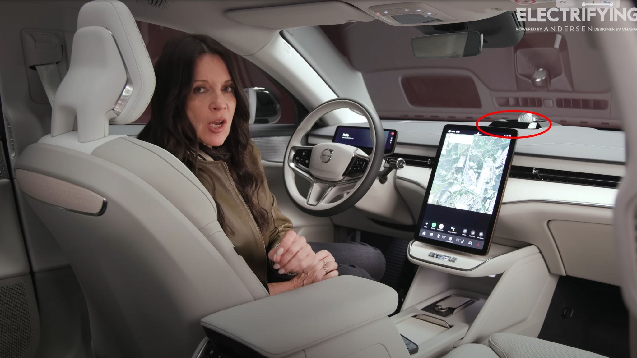 Smart Eye has stated this is a dual-optical path driver and cabin monitoring design. The declaration of "two strategically placed infrared cameras" is assumed to mean the cabin camera is located in the rear-view mirror (RVM), and based on first visual evidence here, the driver is monitored from the center console, highlighted in red. That is clearly a Gentex Corporation mirror, so evidence is building of Gentex reaching SoP with an integrated cabin camera. We will know more when videos of test drives of the ES90 start to appear, and visual evidence of the IR illuminators can be found. Rivian has also just launched its hands-free driving software via an OTA update, which might also feature a Gentex RVM with integrated IR optical path. Again, we will know more as test drive videos surface in the coming weeks.